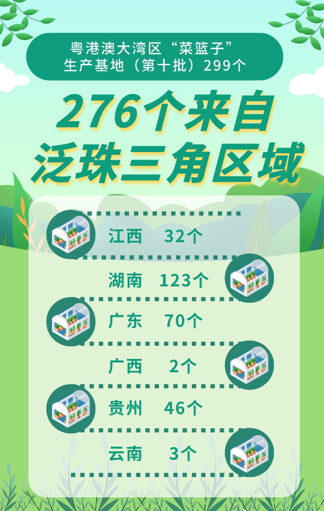 近日,粤港澳大湾区“菜篮子”工作办公室正式公布《粤港澳大湾区“菜篮子”生产基地(第十批)认定名单》,共认定粤港澳大湾区“菜篮子”生产基地299个,其中276个生产基地来自泛珠内地省区,占该批次认定生产基地总数的90%以上。