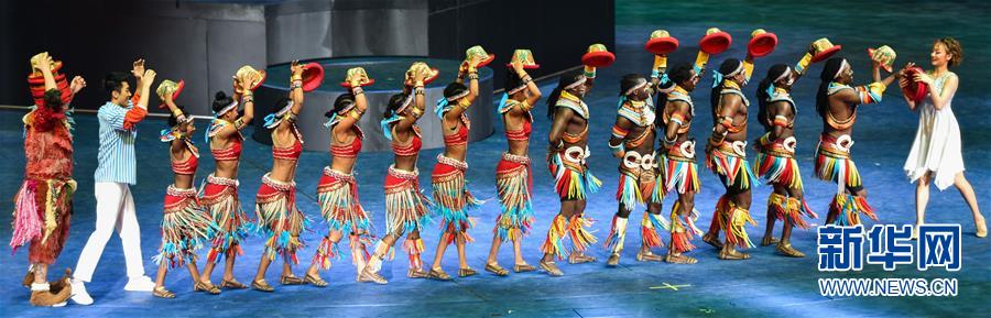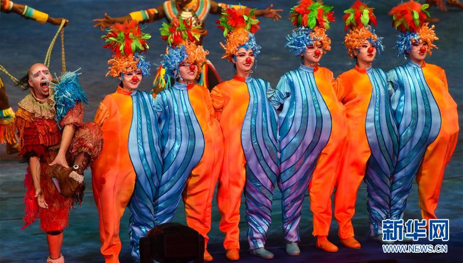 原创国际马戏大剧《龙秀》当中的滑稽表演(7月26日摄)。新华社记者刘大伟摄