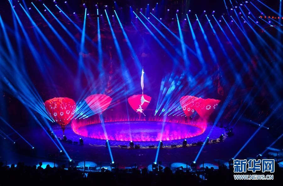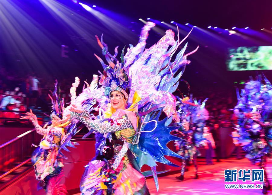 演员在原创国际马戏大剧《龙秀》当中表演“奇幻精灵——手技”(7月26日摄)。新华社记者刘大伟摄