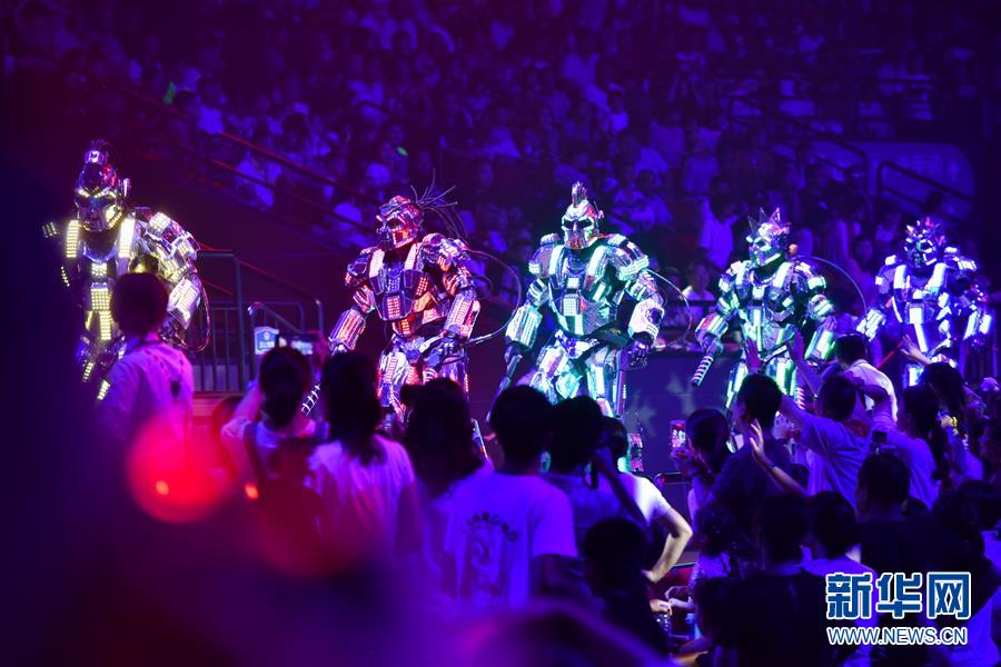 原创国际马戏大剧《龙秀》花车巡游环节,变形金刚从观众身前经过(7月26日摄)。新华社记者刘大伟摄
