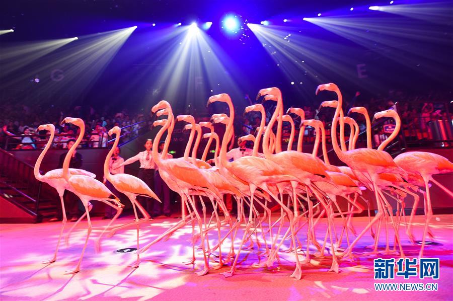 原创国际马戏大剧《龙秀》花车巡游环节,火烈鸟从观众身前经过(7月26日摄)。新华社记者刘大伟摄