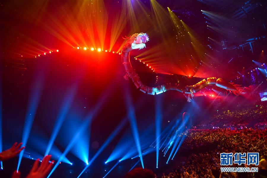 在原创国际马戏大剧《龙秀》当中,一条由隐藏式飞行器装扮成的巨龙飞跃现场观众(7月26日摄)。新华社记者刘大伟摄