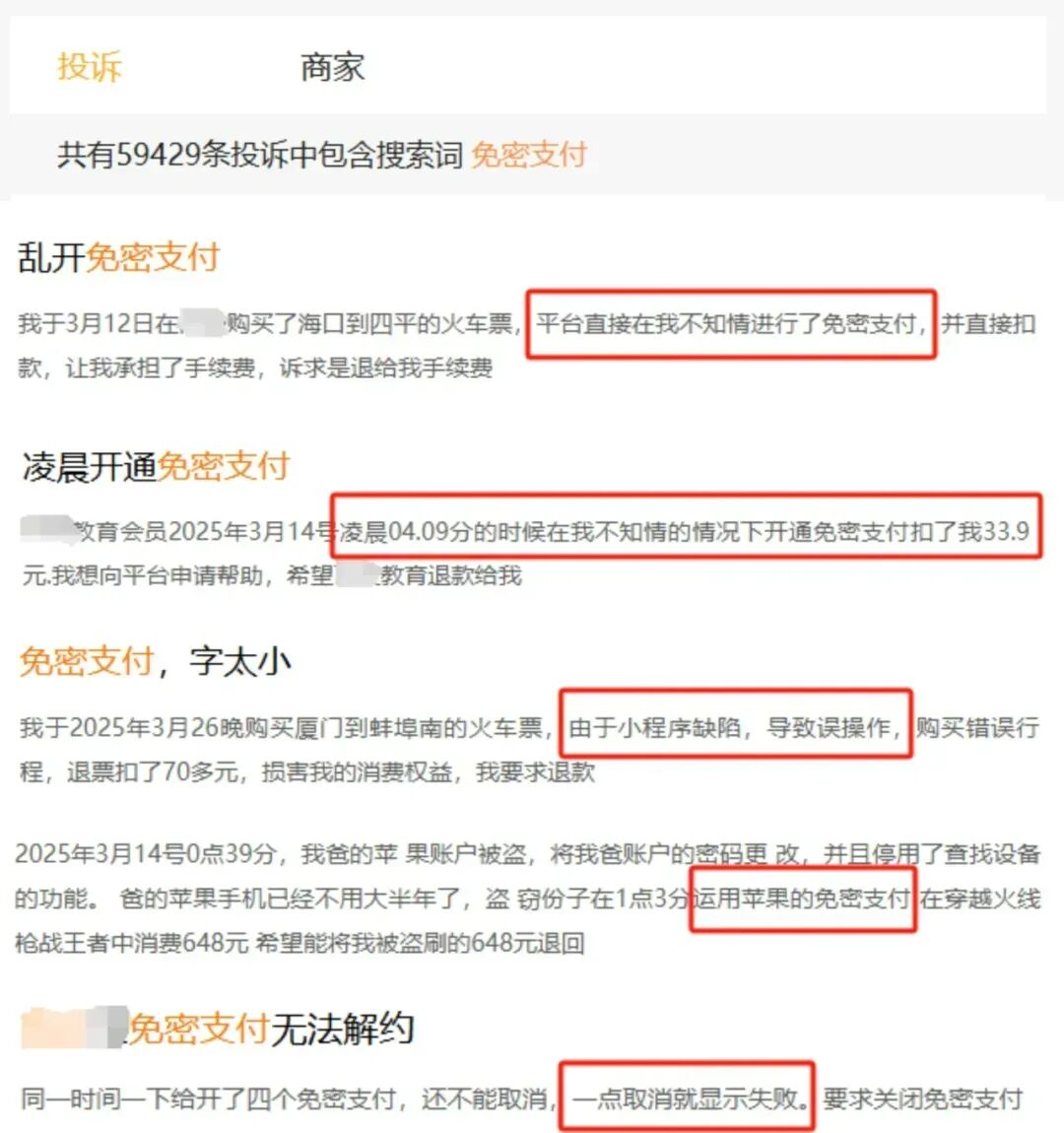 据了解,在某投诉平台上,有近6万条投诉涉及“免密支付”,包括用户在不知情情况下被开通“免密支付”、无法取消、开通后乱扣费等问题。