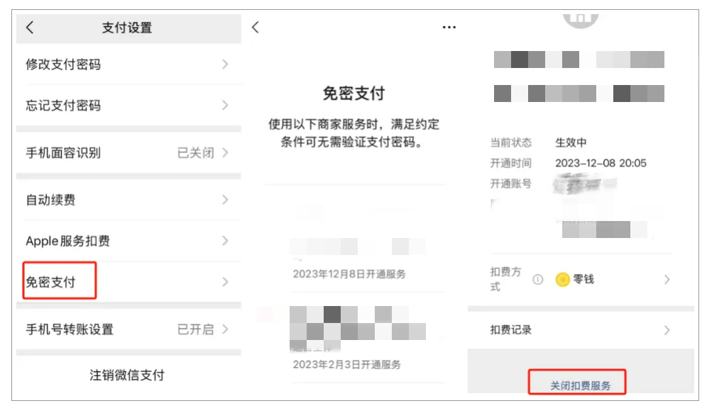 打开微信→点击右下角“我”→服务→钱包→最下方“支付设置”→免密支付→选择相应App后点击最下角“关闭扣费服务”。