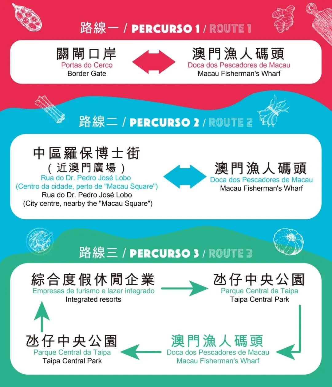 “2025澳门国际美食之都嘉年华”免费入场。为方便旅客及居民到场参与,旅游局于活动期间(7月11至20日)设3条免费穿梭巴士线从关闸口岸、中区罗保博士街、凼仔中央公园及六家综合度假休闲企业旗下位于路凼区酒店往来活动场地。
