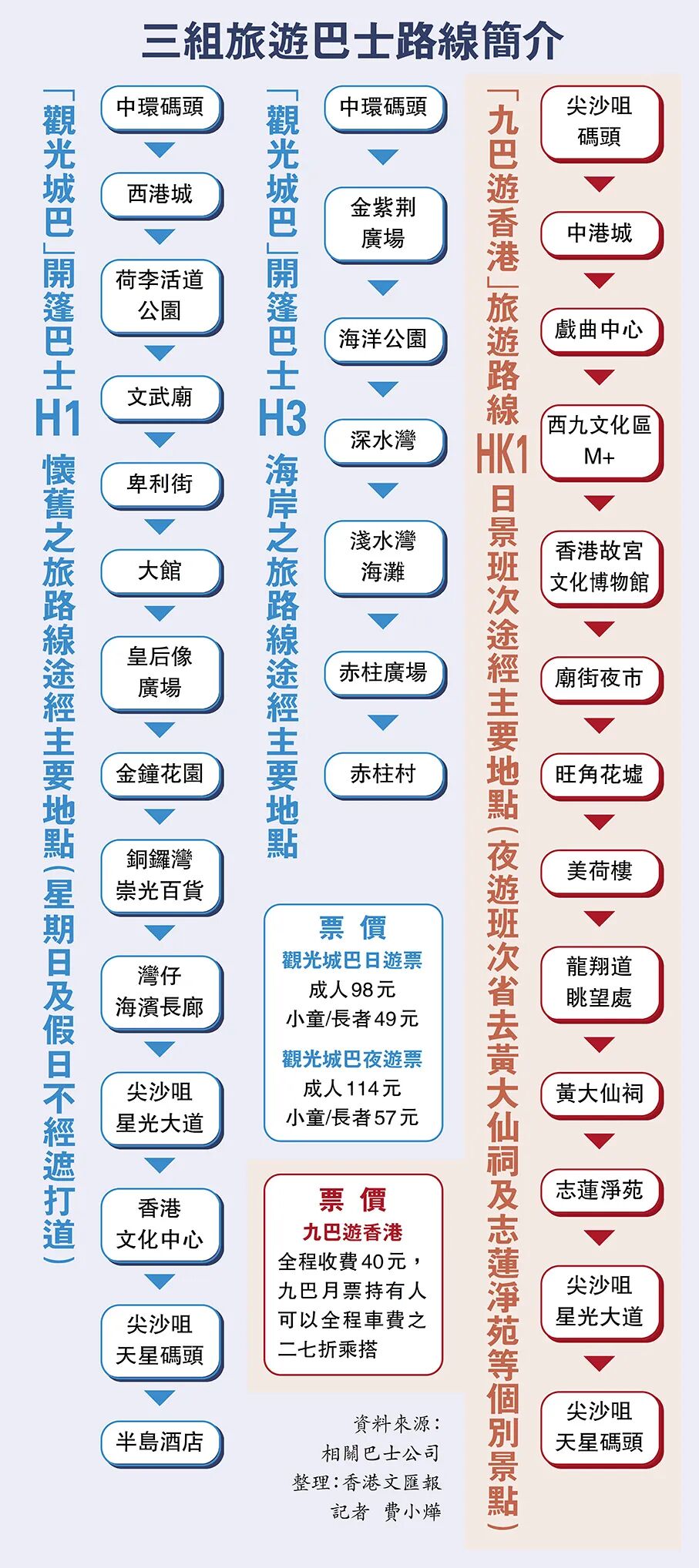 陈美宝介绍,香港特区政府一直希望各公共交通营办商可多“跳出框框”,开拓非票务收入,而两间专营巴士营办商推出的观光巴士路线配搭双层开篷巴士的设计,贯穿南区的海滩、尖沙咀的璀璨夜景,以至西九龙一带的文化景点等热门景点,为旅客带来全新的城市游览体验。观光巴士更获内地社交平台力推,形容感觉犹如在高楼大厦中坐过山车。