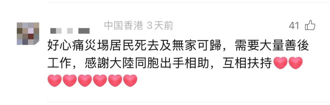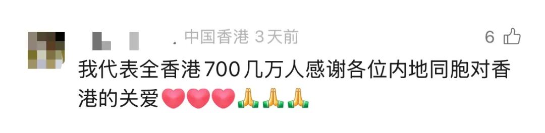 中国红十字会以及许多内地大型企业集团纷纷开展支援行动,一批批爱心善款和救援物资集结驰送香港。内地各省市民众也纷纷伸出援手,涓涓爱心汇聚成支援香港的暖流。各地网友在“大湾区之声”视频号平台下纷纷留言“挺”香港,生动诠释“同胞”的含义。