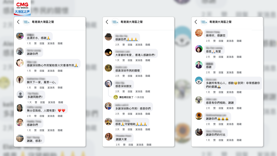 在“粤港澳大湾区之声”脸书平台,这样温暖的互动也随处可见。不少香港网友通过评论区表达对内地同胞的感谢。