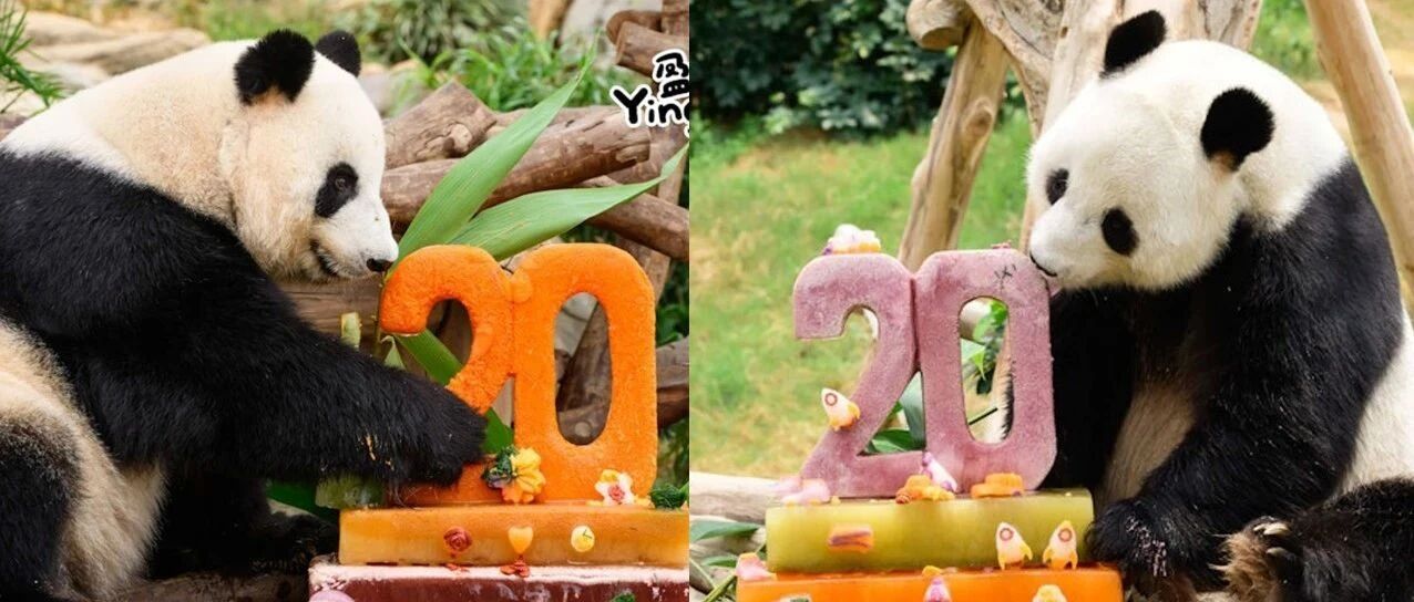 香港大熊猫“盈盈”“乐乐”迎20岁生日,蛋糕很特别→