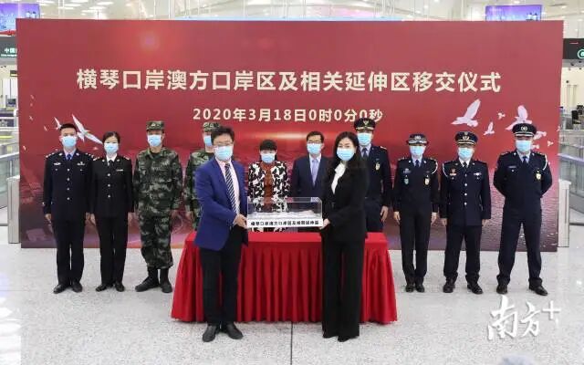 3月18日零时,随着粤方代表将防务交接的象征物——横琴口岸澳方口岸区模型交予澳方代表,横琴口岸澳方口岸区及相关延伸区旅检区域,共计约6.64万平方米,正式移交给澳门特区政府,适用澳门法律管辖。这也是粤澳深度合作区建设进程中,双方共同推进的一项重大成果。