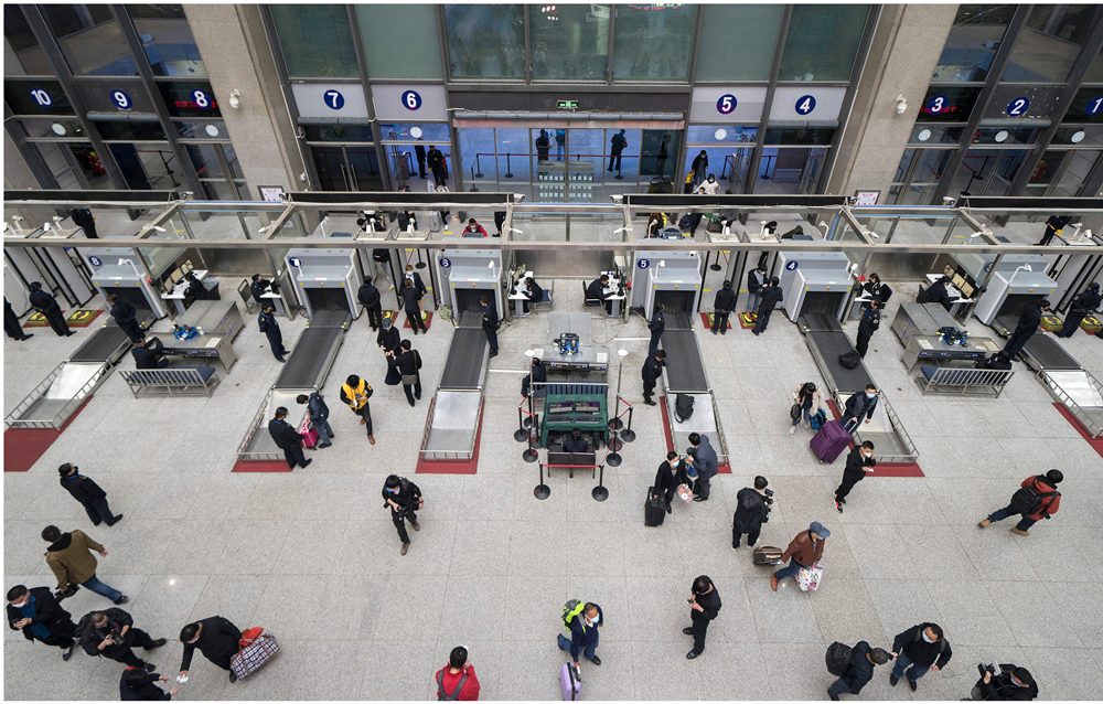 4月8日,在武汉站,乘客排队等待安检。当日,G431次列车由武汉站始发开往南宁东站。资料图