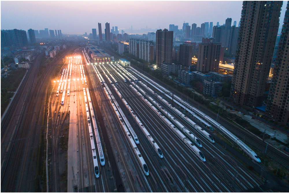 4月8日,在武汉动车段,几十组在武汉动车段经过检修消杀的动车组,犹如“陆地舰队”停靠在存车线上,蓄势待发,重新启程。资料图