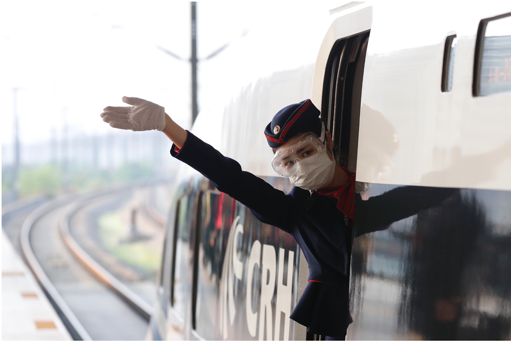4月8日,在武汉站,G431次列车乘务员在发车前向乘客挥手。这是武汉市正式解除离汉离鄂通道管控措施后开往湖北省外的首趟始发列车。资料图