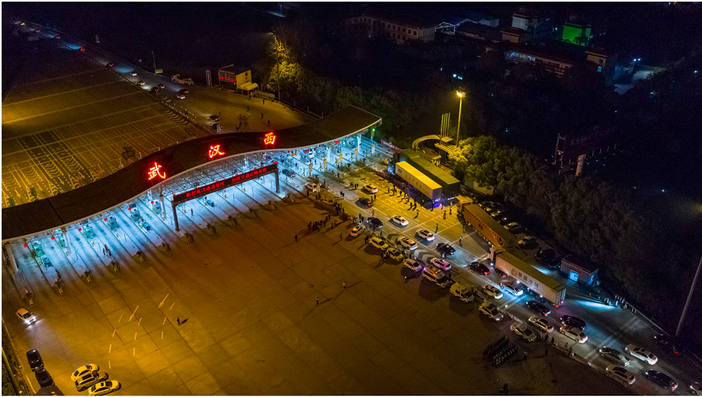 4月8日零时起,武汉市正式解除离汉离鄂通道管控措施,有序恢复对外交通。这是4月8日凌晨,车辆通过武汉西高速收费站(无人机拍摄)。资料图