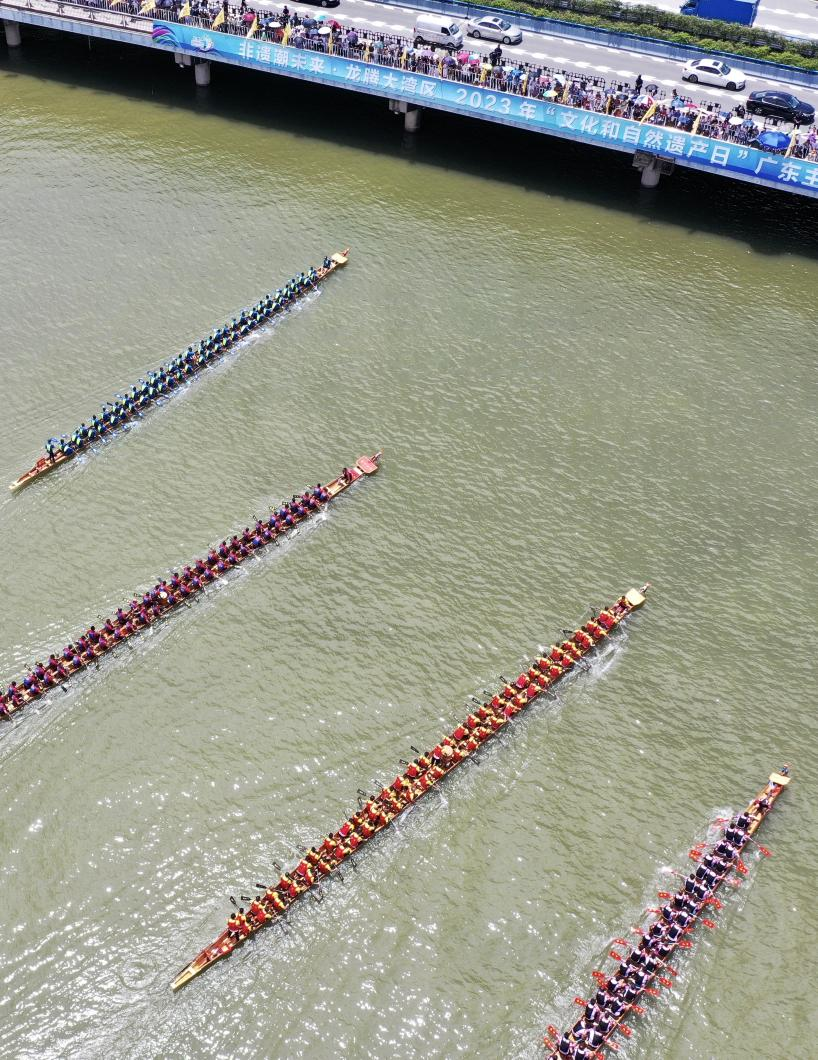 鼓声起,龙舟游,“2023粤港澳大湾区(广东) 龙舟邀请赛”不仅展开了数场激情澎湃的龙舟竞渡,全面展示龙舟文化的独特魅力和深刻内涵,更加强了交流,凸显了“人文湾区,一水同舟;万众一心,赛龙夺锦”的精神内核。