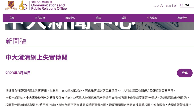 香港中文大学14日澄清:有关传言及报道与事实不符。