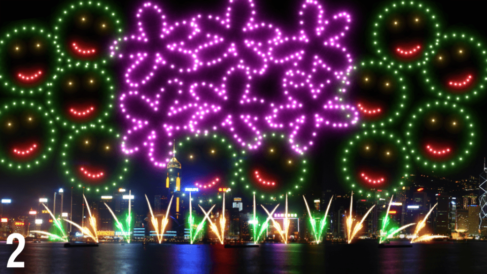 香港已经成为配备领先5G技术的智慧城市。烟花以游星为造型,寓意5G技术下市民生活千变万化、活力十足。