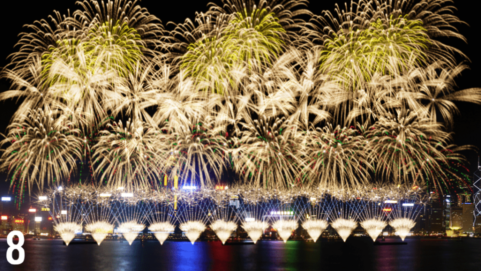 汇演共分为8幕,时长约23分钟,3艘趸船及6艘小浮船在香港会展中心附近海面一字排开,组成9个燃放点,总计将燃放31888枚烟花,营造出800米宽、250米高的烟花效果。