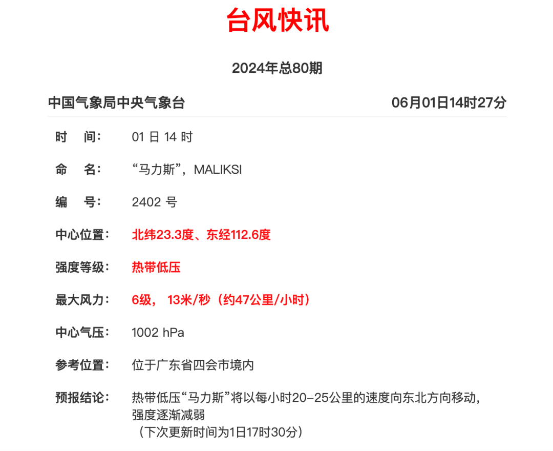 今天(6月1日)凌晨,今年第2号台风“马力斯”在广东阳江登陆。今天白天“马力斯”继续北上,受其影响,广东中部和西北部等地部分地区有暴雨或大暴雨,需注意防范。台风“马力斯”于6月1日凌晨0点55分前后以热带风暴强度登陆我国广东省阳江市阳西县,成为今年首个登陆我国的台风。“马力斯”登陆后强度不断被削弱,下午14时,其中心位于肇庆四会市境内,中心附近最大风力6级(13米/秒)。