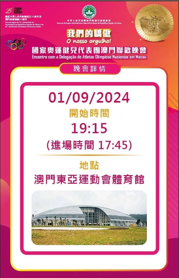 内地奥运健儿代表团8月31日结束访问香港行程后,乘车经港珠澳大桥抵达澳门,将开展为期三天的访问。17时,澳门特区政府在口岸举行欢迎仪式。澳门特区政府、澳门中联办和各界人士代表,以及上百名青少年手持横幅、挥舞着国旗和区旗,热烈欢迎内地奥运健儿到来。记者了解到,在欢迎仪式之后,内地奥运健儿将会出席澳门特区政府举行的欢迎晚宴。明天上午,他们将和澳门青少年运动员交流对话,分享奥运故事,畅谈家国情怀;下午会参观澳门的世界文化遗产景点,感受澳门历史城区以及多元文化融合的独特魅力,这也是市民和游客可以和运动员偶遇的难得机会。后续,内地奥运健儿还将参加以“我们的骄傲”为主题的大型联欢晚会;他们还将分批次走进社区,和澳门居民零距离互动。