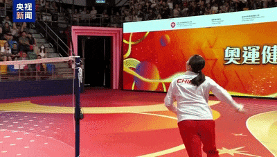 随后,中国羽毛球队的四名队员也带来了趣味接力表演赛,他们需要绕着球网转圈并接到对面打来的羽毛球。