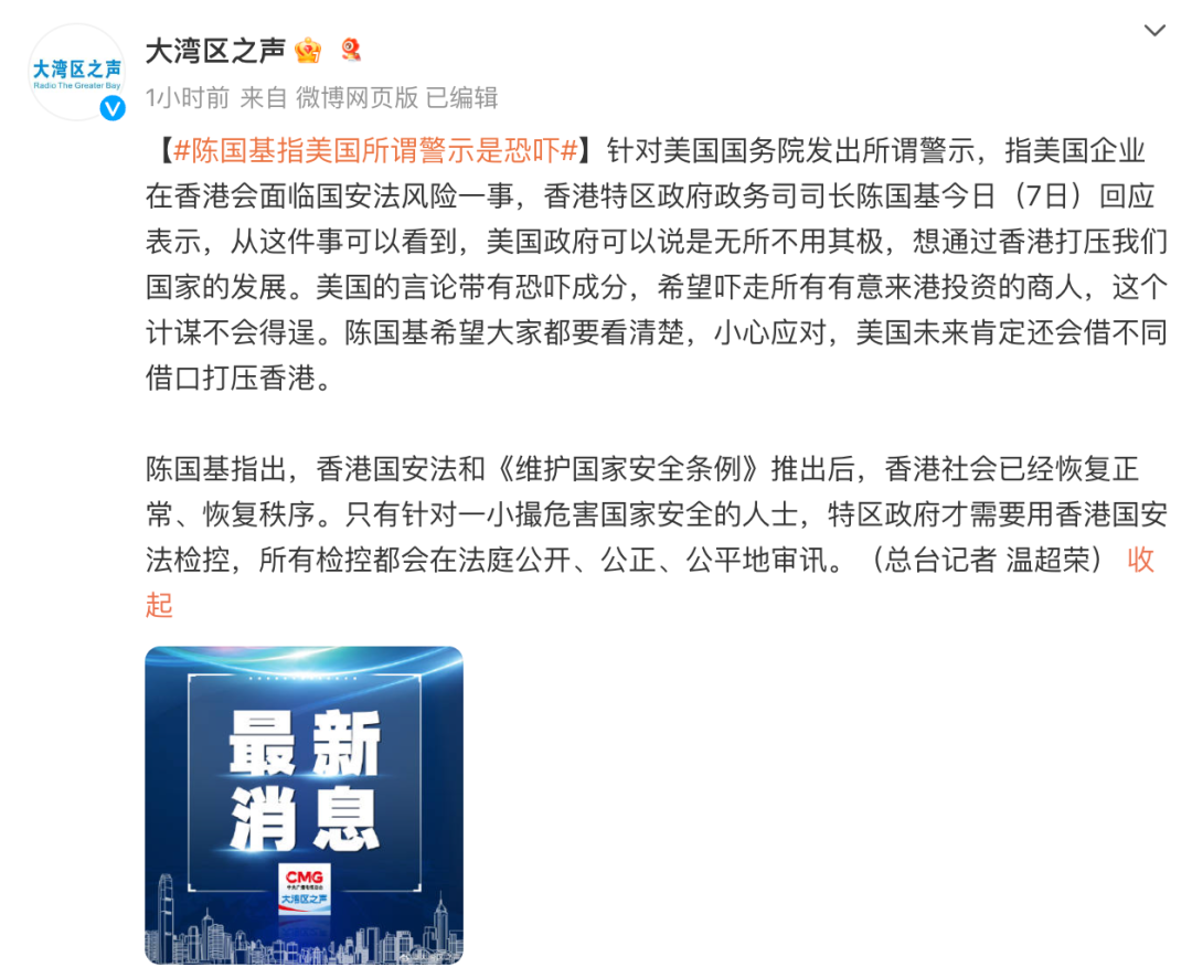 日前,针对美国国务院发出所谓警示,香港特区政府政务司司长陈国基回应表示,“从这件事可以看到,美国政府可以说是无所不用其极,想通过香港打压我们国家的发展。美国的言论带有恐吓成分,希望吓走所有有意来港投资的商人,这个计谋不会得逞。”