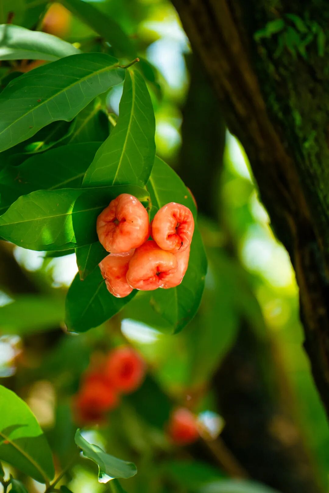 这些粉色的果子,就是莲雾,一种来自热带的神秘水果。莲雾学名洋蒲桃,莲雾原产自马来西亚及印度,在1624-1662年由荷兰人从爪哇引入我国。莲雾是典型的热带亚热带植物,适应性强,性喜温暖,怕寒冷,喜好湿润的肥沃土壤。莲雾的叫法在各地也有所不同,广东名为“棉花果”,潮汕地区称作“莲雾”或“水翁”,也在一些地方叫作“甜不”,还因为从树上掉落扑通的一声响而得名“扑通”。面对街头树上挂满的莲雾,不少市民跃跃欲试,想要一尝为快。但是专家提醒,街头的莲雾不建议食用!