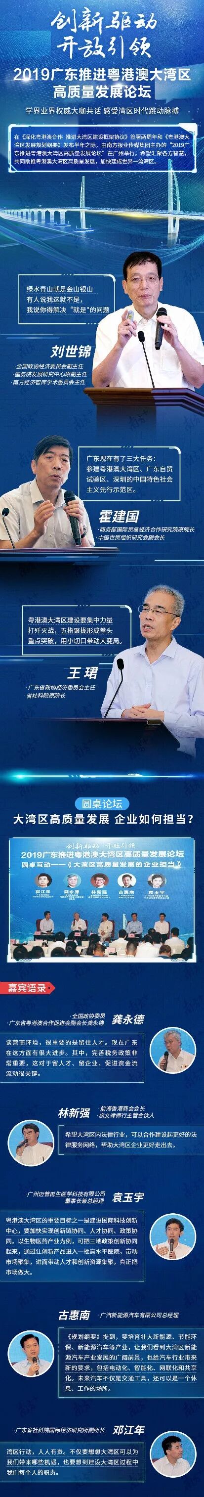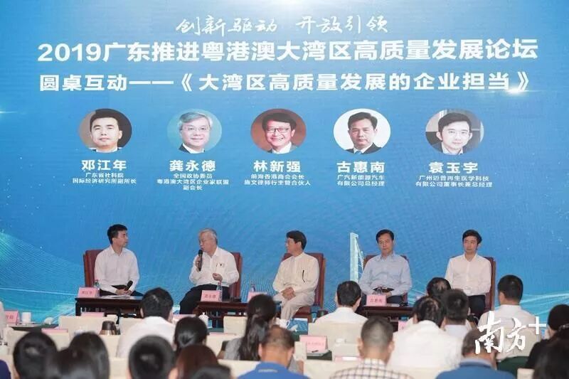 论坛上,省领导致辞。全国政协经济委员会副主任、国务院发展研究中心原副主任、南方经济智库学术委员会主任刘世锦,商务部国际贸易经济合作研究院原院长、中国世贸组织研究会副会长霍建国,省政协经济委员会主任、省社科院原院长王珺作主旨发言。省社科院国际经济研究所副所长邓江年,全国政协委员、广东省粤港澳合作促进会副会长龚永德,前海香港商会会长、施文律师行主管合伙人林新强,广汽新能源汽车有限公司总经理古惠南,广州迈普再生医学科技有限公司董事长兼总经理袁玉宇围绕“大湾区高质量发展的企业担当”主题开展圆桌讨论。