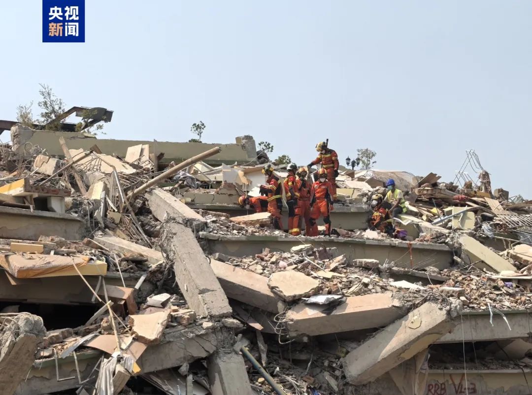 缅甸当地时间4月1日,中国救援队联合中国香港特区救援队深入曼德勒受灾最严重的天空公寓救援点开展联合搜救。