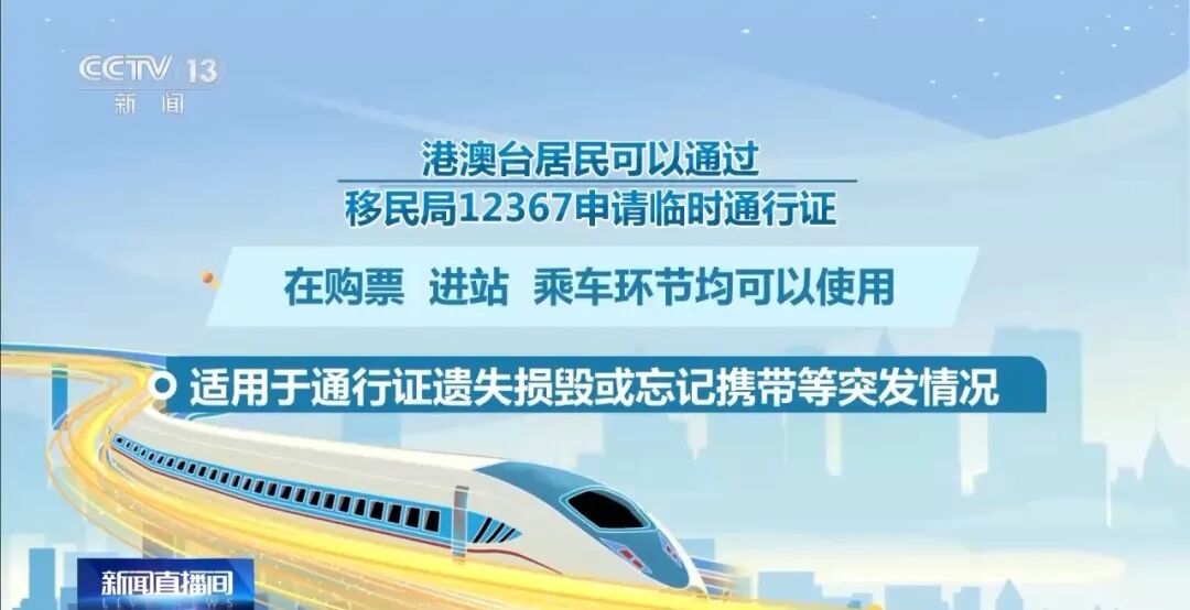 港澳台居民可以通过移民局12367申请临时通行证,在购票、进站、乘车环节均可以使用,适用于通行证遗失损毁或忘记携带等突发情况。
