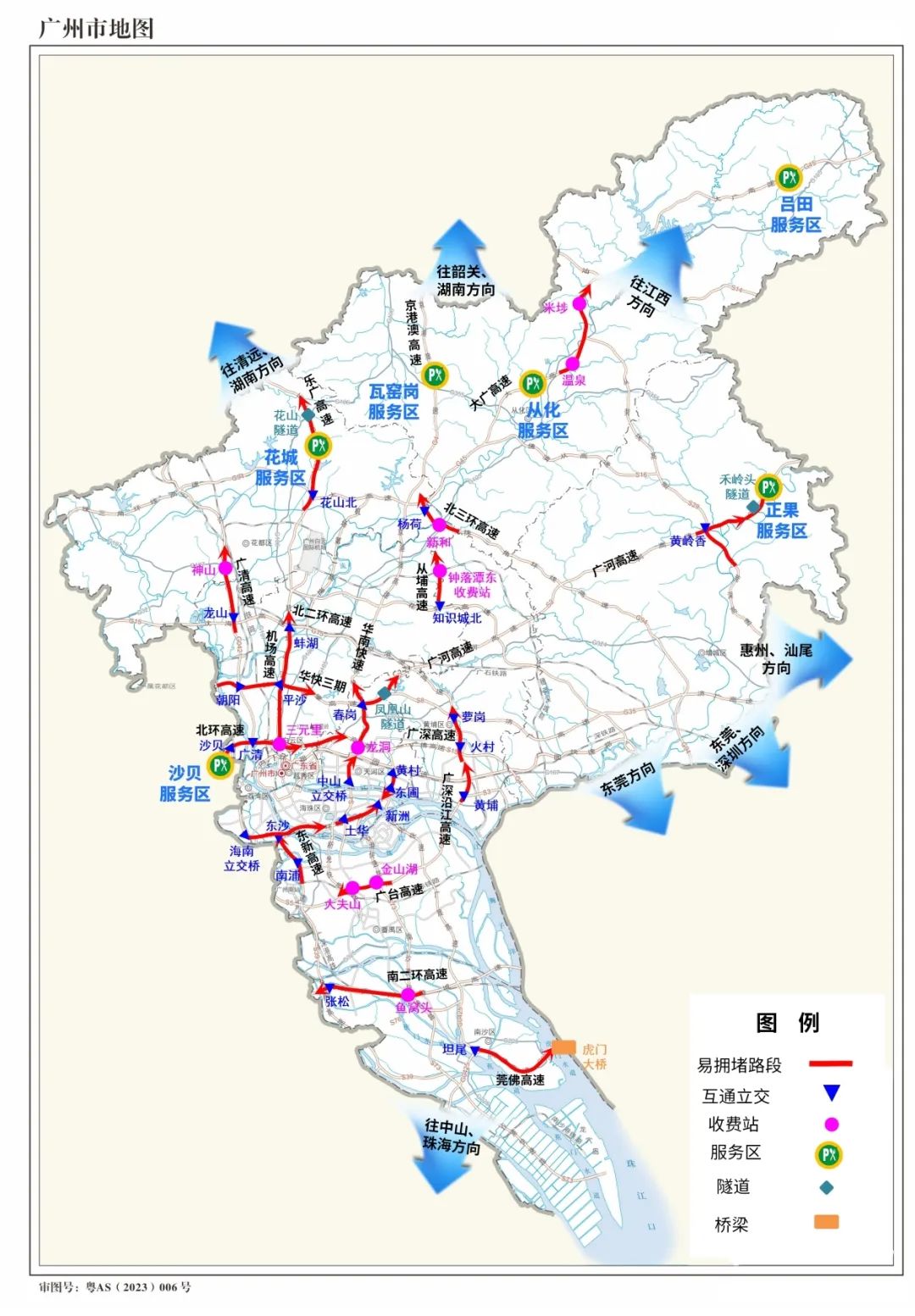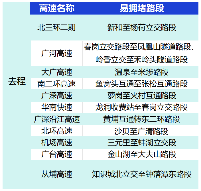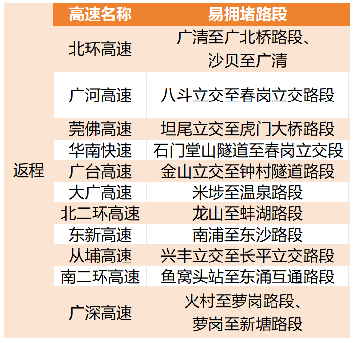 高速公路或现多波出行高峰:节前一日(4月30日)16时-24时、假期首日(5月1日)9时-14时为出城高峰;假期第三、四日(5月3日-4日)迎来进出城双向小高峰;假期最后一天(5月5日)15时-23时返程客流集中。出城易缓行路段包括机场高速、大广高速、广深高速等;返程易缓行路段包括广河高速、莞佛高速、从埔高速等。