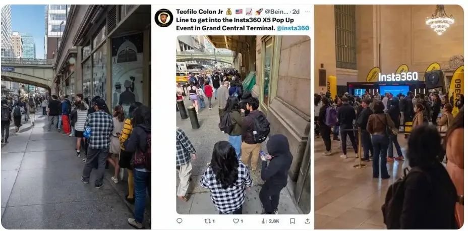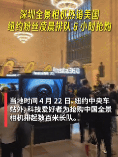 纽约中央车站是美国最繁华的交通枢纽之一,当地时间4月22日,海外科技爱好者们在车站外排起长队,抢购一款能拍摄360度影像、自拍杆可自动“隐形”的国产相机。现场的视频显示,抢购的队伍排到了数百米开外。该款相机的生产商为深圳智能影像品牌——影石Insta360。