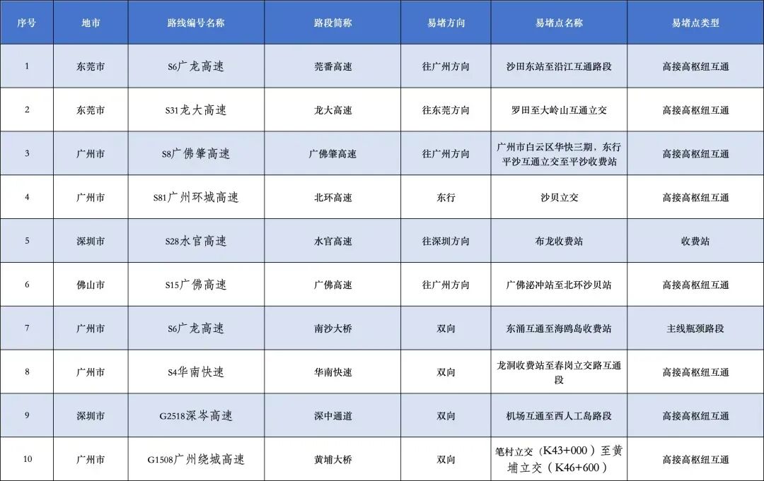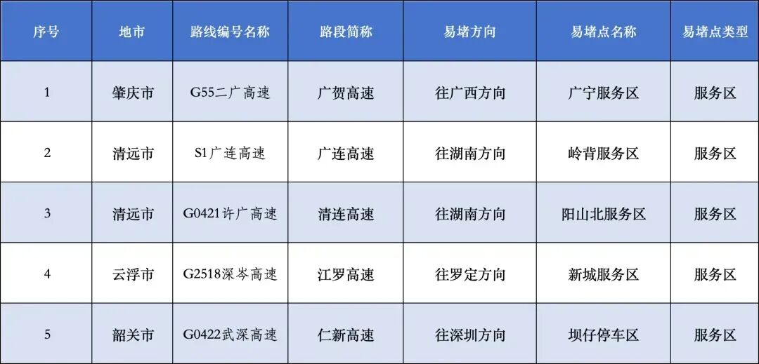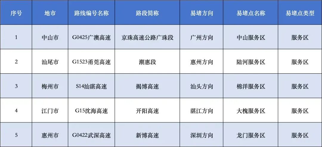 根据交通部门预测,结合往年出行情况,预计5月5日假期最后一天迎来返程小高峰,车流约达902万车次。经与广东省交通运输厅联合研判,今年广东省“五一”期间较为拥堵的路段、车流繁忙服务区、充电繁忙服务区有以下几处: