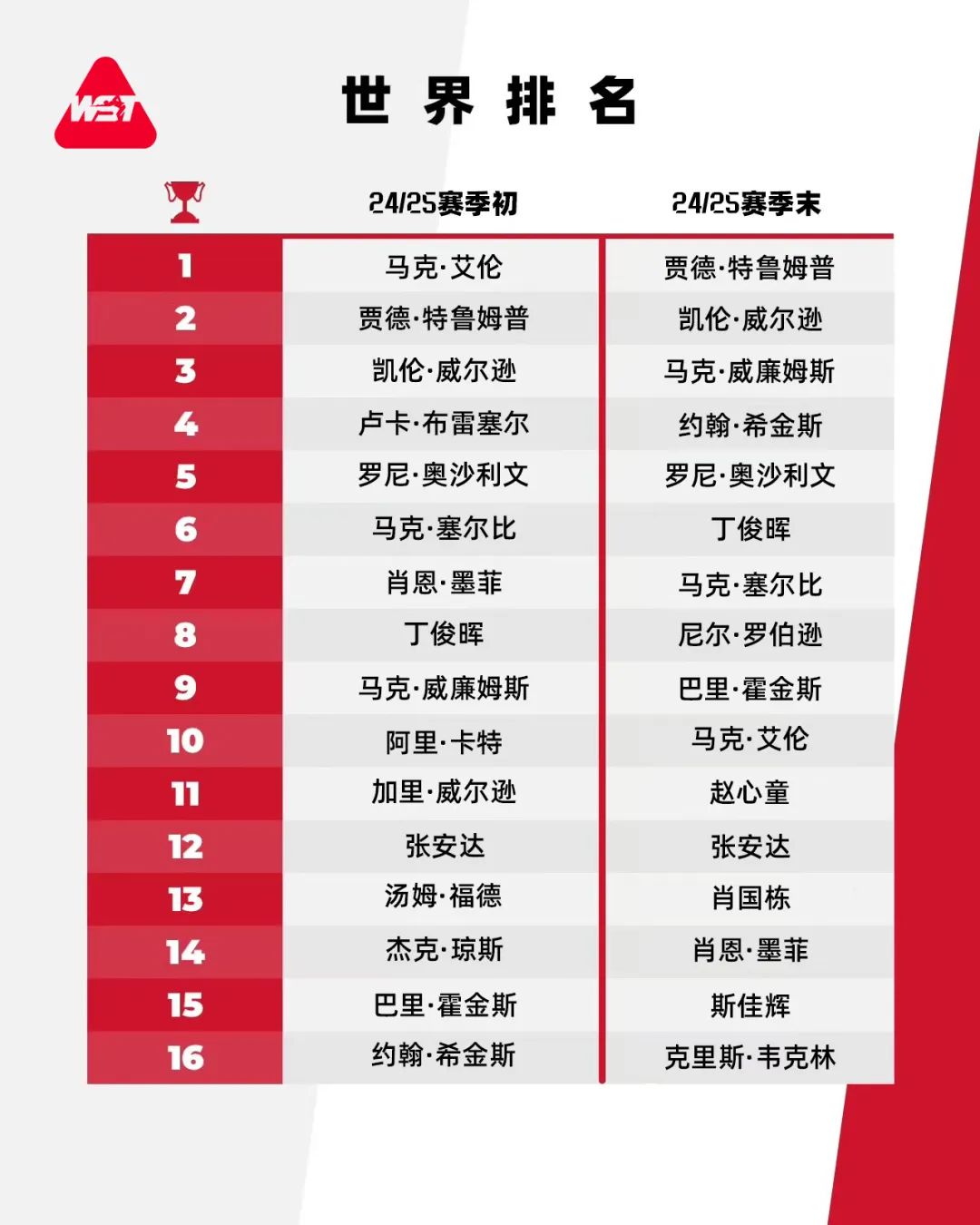根据世界斯诺克协会官网更新的世界排名,赵心童世界排名上升至第11位,位列中国球手中的第2位,第1位仍然是丁俊晖,排在世界第6。张安达、肖国栋、斯佳辉分列第12、13和第15位,共有5位中国球手跻身世界前16。根据赛程安排,2026年斯诺克世界大奖赛将于2026年2月3日至8日在香港举行,届时世界排名前32的球手将再度云集。中国香港桌球总会主席罗永聪表示,今年3月举办的2025年斯诺克世界大奖赛标志着香港时隔35年后再次举办斯诺克排名赛,令球迷能亲身观赏高水平排名赛事。