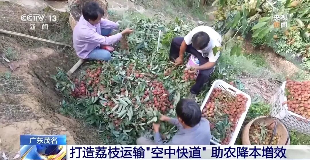 眼下,广东茂名迎来荔枝采收旺季。在广东茂名平山镇的仁耀垌村荔枝园内,果农忙着采摘、分拣、装箱,随后将新鲜荔枝搬运到不远处的无人机装载点。
