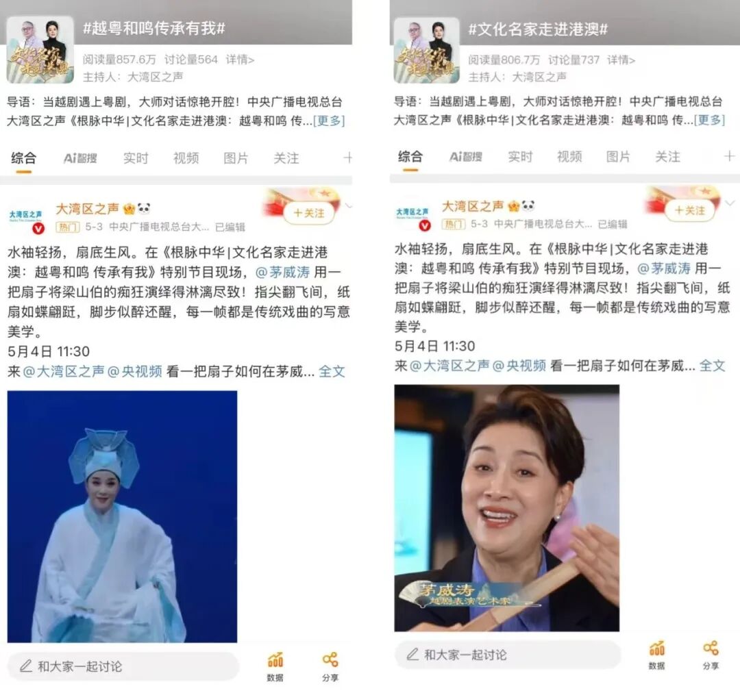 《根脉中华 | 文化名家走进港澳》首期以戏曲为纽带,实现了一次跨越地域界限的文化“双向奔赴”。茅威涛的越剧柔美、阮兆辉的粤剧刚劲,以及青年演员的先锋活力,在香江之畔汇聚成一场流动的文化盛宴。通过直播、短视频及话题讨论,全网触达量突破2000万,引发热烈反响。