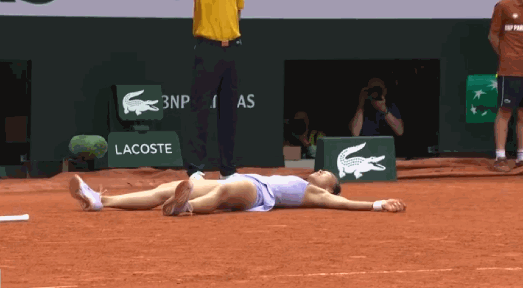 在兑现赛点的那一刻,郑钦文躺倒在地,尽情庆祝这场鏖战2小时47分钟获得的胜利。