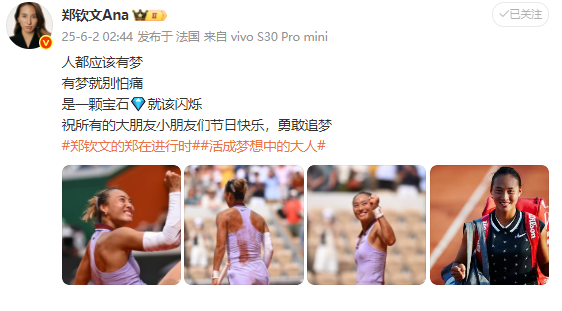 获得新突破后,郑钦文在社交媒体发文送上儿童节祝福:“人都应该有梦,有梦就别怕痛,是一颗宝石??就该闪烁”,并鼓励大朋友小朋友“勇敢追梦”。