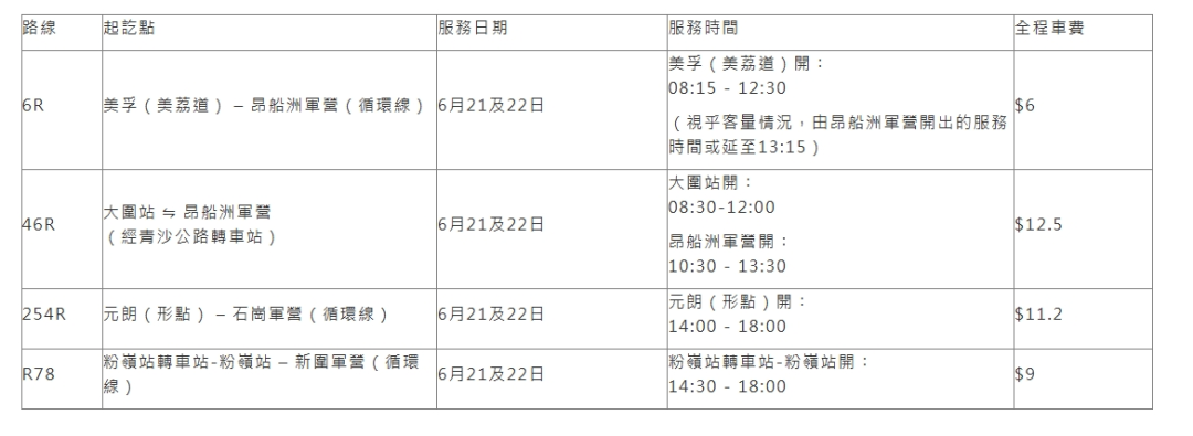 香港九巴宣布,为配合军营开放活动,将于6月21日及22日特设4条特别线,接载参观人士到访三个军营,详情如下↓