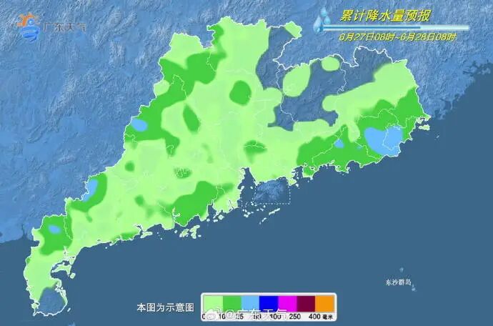 27日白天-28日,阳江、汕尾、韶关、清远、河源和珠江三角洲大部市县有中(雷)雨局部暴雨,其余市县有(雷)阵雨局部大雨。