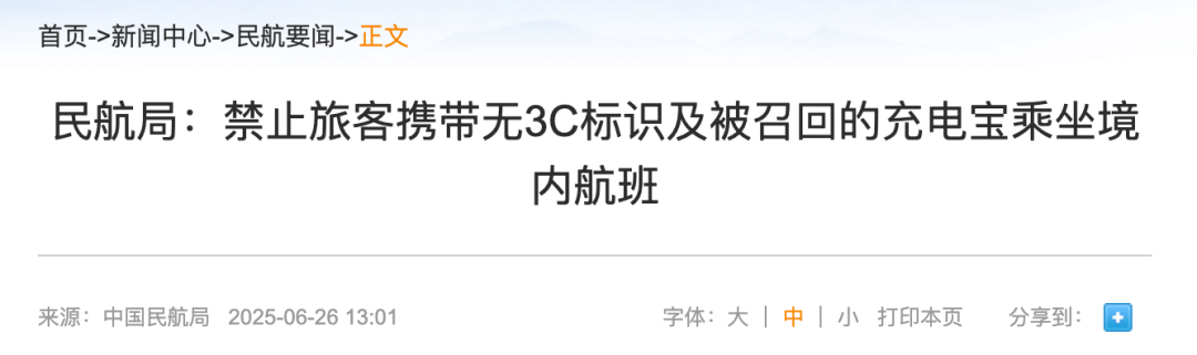据悉,今年以来,旅客携带的充电宝等锂电池产品机上起火冒烟事件多发。近期多个头部品牌充电宝厂家因电芯存在安全风险对多批次产品实施召回,国家市场监管总局撤销或暂停了多个充电宝及电池芯厂家3C认证,上述情况表明旅客随身携带的充电宝存在安全质量隐患,给民航安全运行带来的风险持续增大。对此,民航局决定在现行政策基础上,按照国际通行的《危险物品安全航空运输技术细则》,进一步采取严格的管控措施,并要求民航相关单位加强组织、做好宣传告知、严格查验、改进服务、做好应急准备等工作。