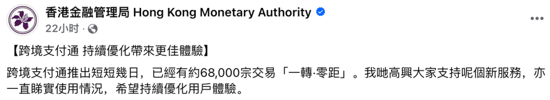 香港金融管理局24日在社交媒体发文表示,跨境支付通推出短短几日,已有约68000宗交易“一转·零距”。金管局表示,很高兴大家支持这项新服务,金管局正跟进使用情况,希望持续优化用户体验。