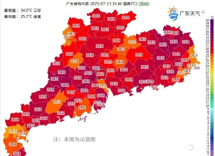 13-14日,广东省多雷雨天气,局部雨势强烈,珠三角西部及粤西的部分市县最高气温35℃左右;15-16日,广东省高温炎热伴有午后分散(雷)阵雨,大部市县最高气温将介于34~37℃。