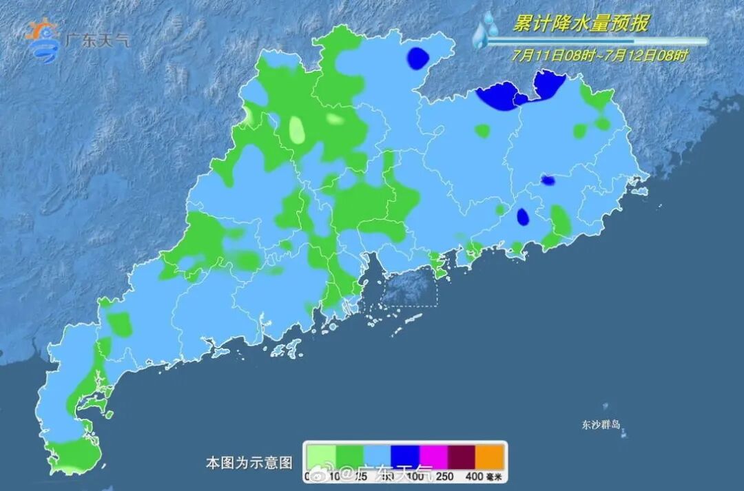 11日,粤东、粤北、珠江三角洲大部分市县有大到暴雨,其中河源、梅州和粤东市县局部有大暴雨,其余市县有中雷雨局地暴雨。12日,广东省西部市县有中到大雨局部暴雨,其余市县有阵雨。13日,广东省大部多云到晴,部分市县有(雷)阵雨,大部分市县最高气温回升至33-35℃。