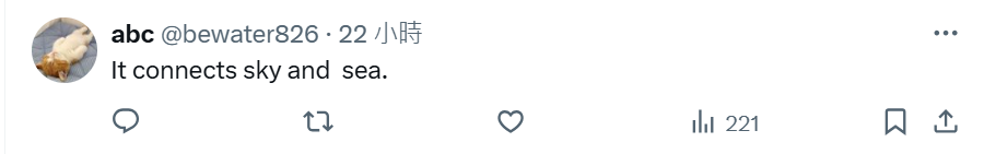 这条内容发出仅几小时,就收获了6万余次播放和大量海外网友转发。有网友说,它看起来像是连接了天空和大海。也有网友说,这是令人惊叹的工程壮举。还有网友说,我想看看驾车穿越这条通道的视频。更有网友说,我想去中国亲眼看看这个工程奇迹。
