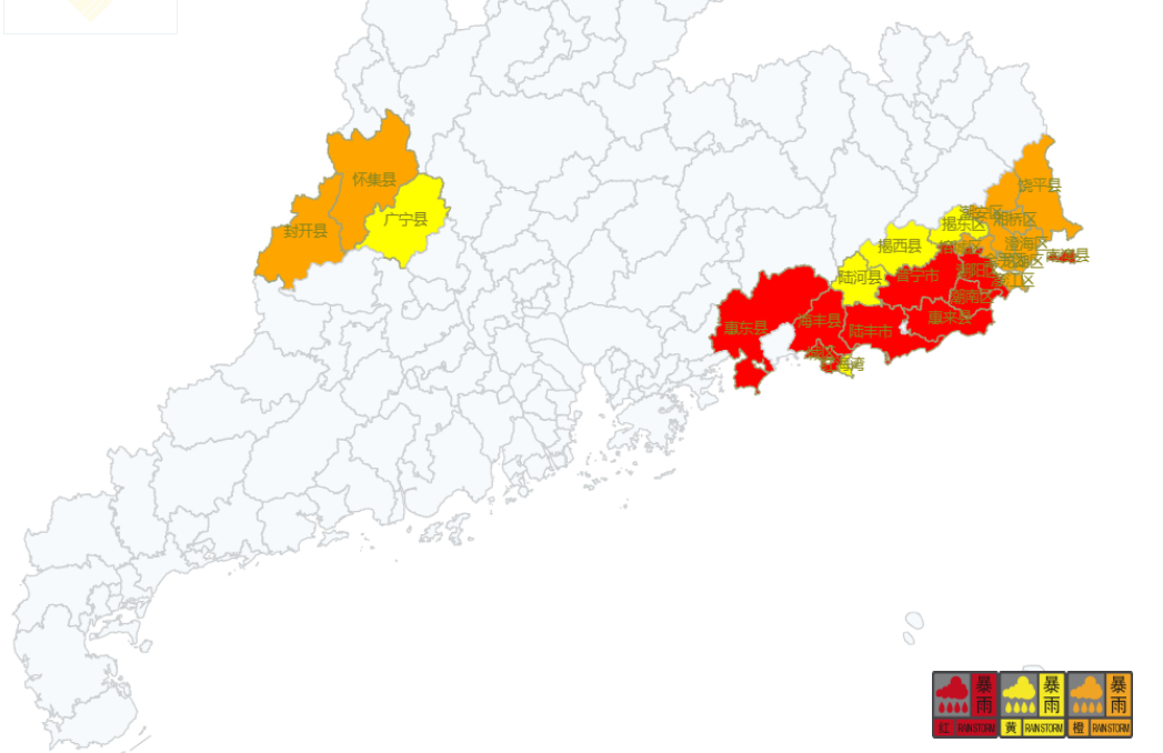 据广东省气象部门消息,截至8月3日9时,惠州市惠东县、肇庆市封开县、汕尾市海丰县、揭阳市惠来县、汕头市潮阳区、潮南区发布暴雨红色预警。