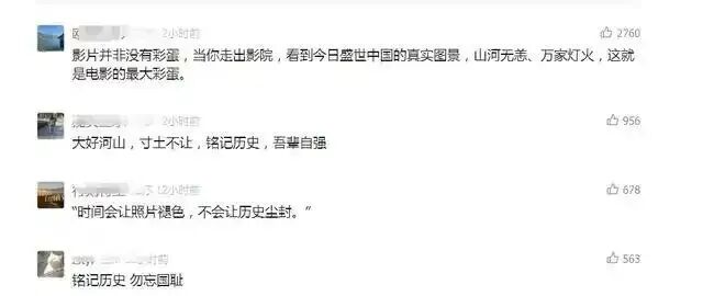 一帧帧光影,揭开抗战往事,传递深刻昭示。正如那条引发无数观众共鸣的影评——“影片并非没有彩蛋,当你走出影院,看到今日盛世中国的真实图景,山河无恙、万家灯火,这就是电影的最大彩蛋。”