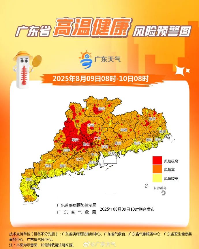 近期极端天气多发,8月9日12时,广东省疾病预防控制局、广东省气象局联合发布高温健康风险预警:预计8月9日,除南部沿海市县外,广东省大部分地区高温健康风险高。其中清远、韶关北部、河源南部、梅州北部、肇庆、云浮、佛山、广州、东莞等地高温健康风险极高,注意防暑降温。
