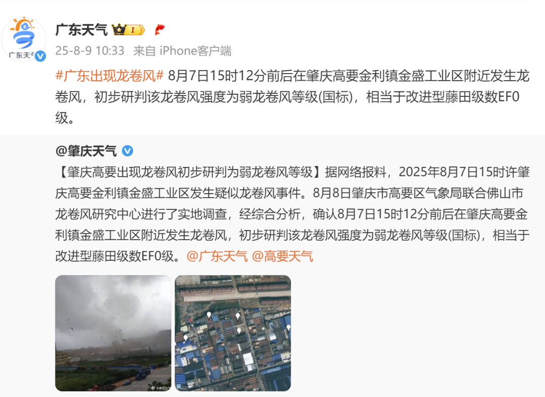 据广东省应急管理厅9日消息,肇庆市高要区气象局联合佛山市龙卷风研究中心于8日进行了实地调查,经综合分析,确认7日15时12分前后,在肇庆高要金利镇金盛工业区附近发生龙卷风。