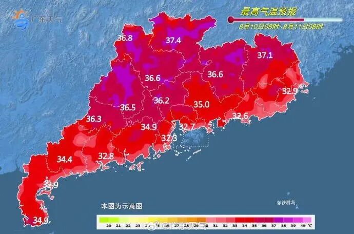 9日,广东大部市县多云间晴天,午后局部有(雷)阵雨;最高气温:沿海市县33~34℃,其余市县普遍介于35~37℃。